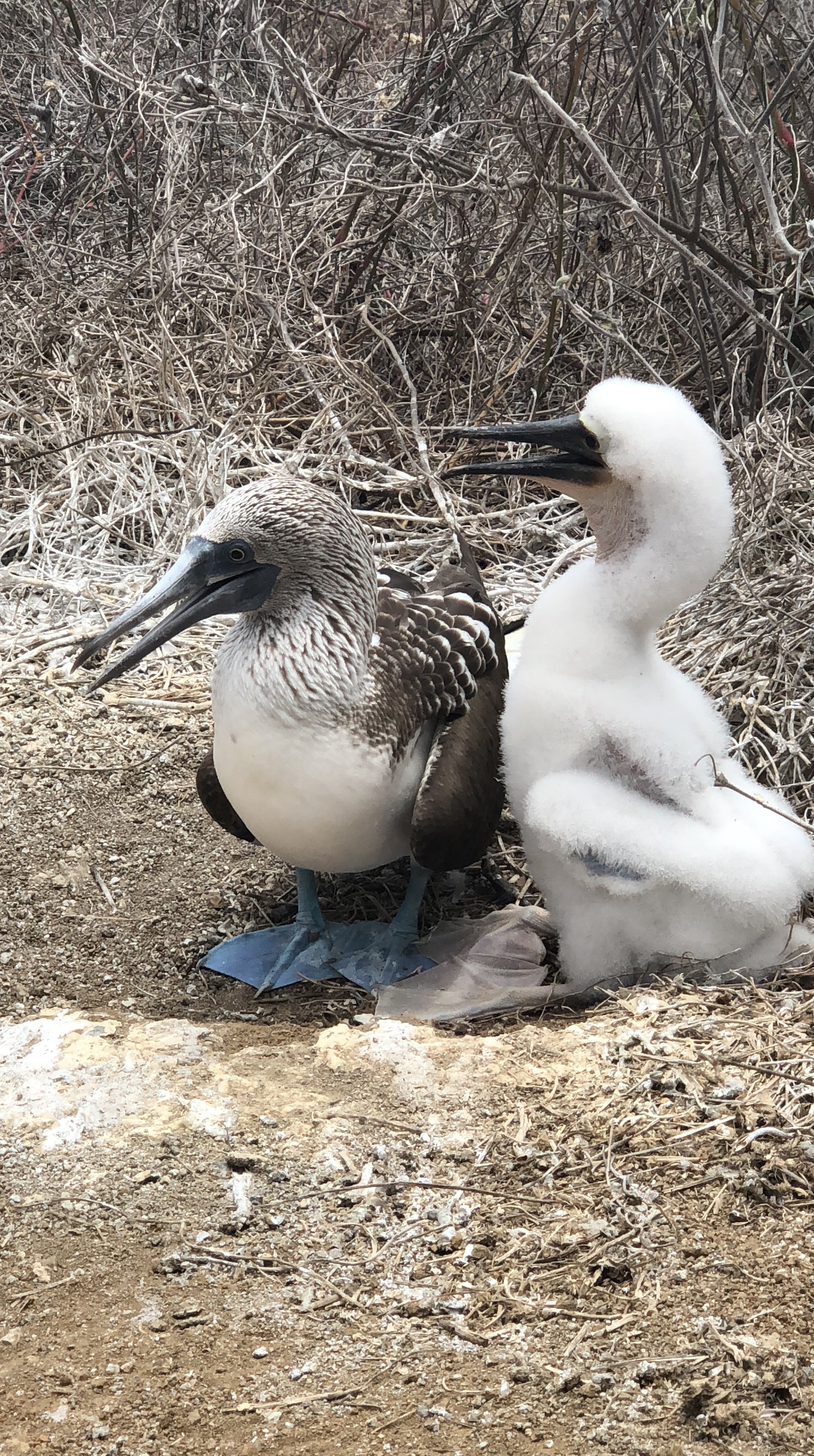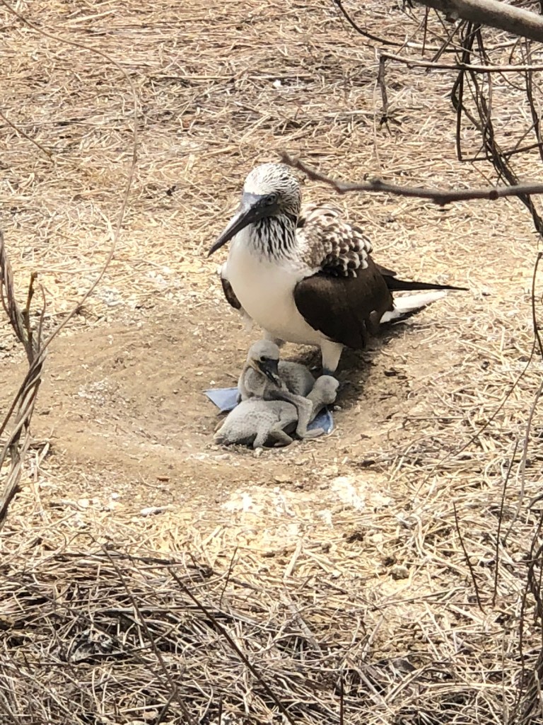 After about two hours of being out in the ocean and whale watching we finally made it to the island. Seeing blue-footed boobies was so fun. I didn’t realize how interesting these birds were until I learned a little more about them. Blue-footed boobies take parenting very seriously and understand sharing their parental duties better than some humans. Both the mother and father take part in incubating the eggs and caring for and protecting the baby once it is born until it is ready to venture off on its own. Unlike most birds who build their nests up on trees, blue-footed boobies build their nest on the ground. So as we hiked through the trails of the island, we got to walk past them and their babies at very close proximity. The fathers and mothers are so protective they did not allow for us to cross that invisible line of safety they had created. I had never witnessed a species of bird that protective over their young.